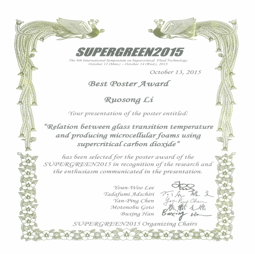方涛教授团队博士生李若松被授予会议最佳海报奖,论文题目为“Relation between glass transition temperature and producing microcellular foams using supercritical carbon dioxide”,研究了高分子聚合物玻璃化转变温度与微孔发泡饱和温度的变化关系,可用于揭示超临界流体微孔发泡的过程机理。