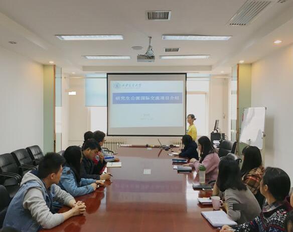 首先,杨艳老师介绍了研究生公派国际交流项目。她分别从国家留学基金委公派研究生项目、博士生短期出国访学项目、研究生出国(境)参加高水平国际学术会议等方面进行了深入浅出的介绍,重点解读了国家公派留学项目的选派计划、选派条件等政策规定。国家公派留学项目对学校培养具有国际视野及竞争力的拔尖创新型人才及促进相关学科与国外高水平大学的深层次合作有着十分重要的意义。杨老师指出研究生国际交流项目种类较多,其中有“国家队”、“校队”“自由行”等,总有一类适合同学们,鼓励大家“世界那么大,你该出去看看” !