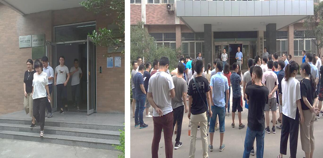 演练模拟某实验室发生有害化学品泄露事故,需要全楼紧急疏散。随着现场指挥宣布演练开始,实验操作员立即通知其所在楼层安全负责人,并通报负责人必要信息,接报的负责人第一时间通知其他楼层负责人,吹响警哨,通知并组织本楼层人员有序、快速撤离。各实验室内人员在听到警哨后也迅速用湿毛巾、湿巾掩住口鼻,关闭门锁,选择最近的楼梯快速疏散。各楼层的安全责任人在人员疏散完毕最后撤离。