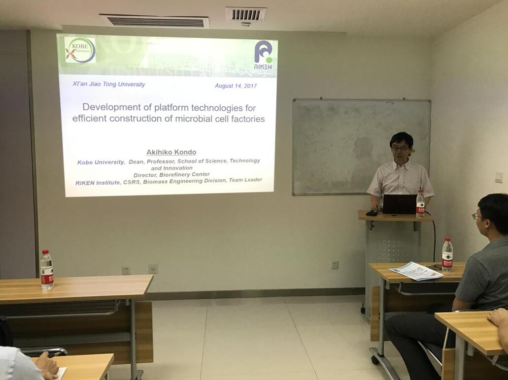 进行学术交流。访问期间,Akihiko Kondo教授做了题为“Development of platform technologies for efficient construction of microbial cell factories”的学术报告。Akihiko Kondo教授的报告主要讲述了平台技术的发展及其在微生物细胞工厂构建过程中的应用,并设计了具有特定功能的细胞直接用于生物燃料和化学品的生产。具体报告内容如下:细胞表面展示技术,包括:细胞粘附、生物转化、分子识别、信号传导等,Akihiko Kondo教授成功的在酵母乳酸菌、棒形菌设计了一系列细胞表面展示系统;合成生物工程平台的构建(GDCP),包括:合成途径、基因组设计、基因表达调控、基因簇设计、长链DNA合成。此外,Akihiko Kondo教授主导的生物炼制,细胞工厂,新药及药物载体设计等相关课题研究在生物化工和能源化工方面都具有重要的应用价值。Akihiko Kondo教授的讲座使学生开阔了视野、增长知识,还能积极促进西安交通大学和线上老虎机游戏网站