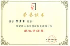 杨贵东副教授课题组通过真实项目牵引,构建了大学生创新训练平台。先后指导了21名本科生承担8项(3项国家级、3项省级和2项校级)大创项目,已结题7项(4项为优秀)。其中,指导严孝清、赵士舜、安华、叶科等本科生于2015和2016年两次获得第八届、第九届全国大学生创新创业年会“优秀论文奖”(是西安交通大学唯一一位连续两次指导本科生获得该奖项的老师)。指导研究生/本科生于2016年获得首届“丝绸之路”国际大学生创新创业大赛国际赛一等奖(由科学技术部、教育部、甘肃省人民政府、外事局等6家单位共同主办)。指导本科生获首届苏州独墅湖大学生创业夏令营“项目路演优秀奖”。指导研究生/本科生获得2016年金张掖创新创业大赛三等奖。杨贵东副教授在创新创业教育指导方面大胆创新,将基础研究与工业实践相结合,取得了可喜的成果。