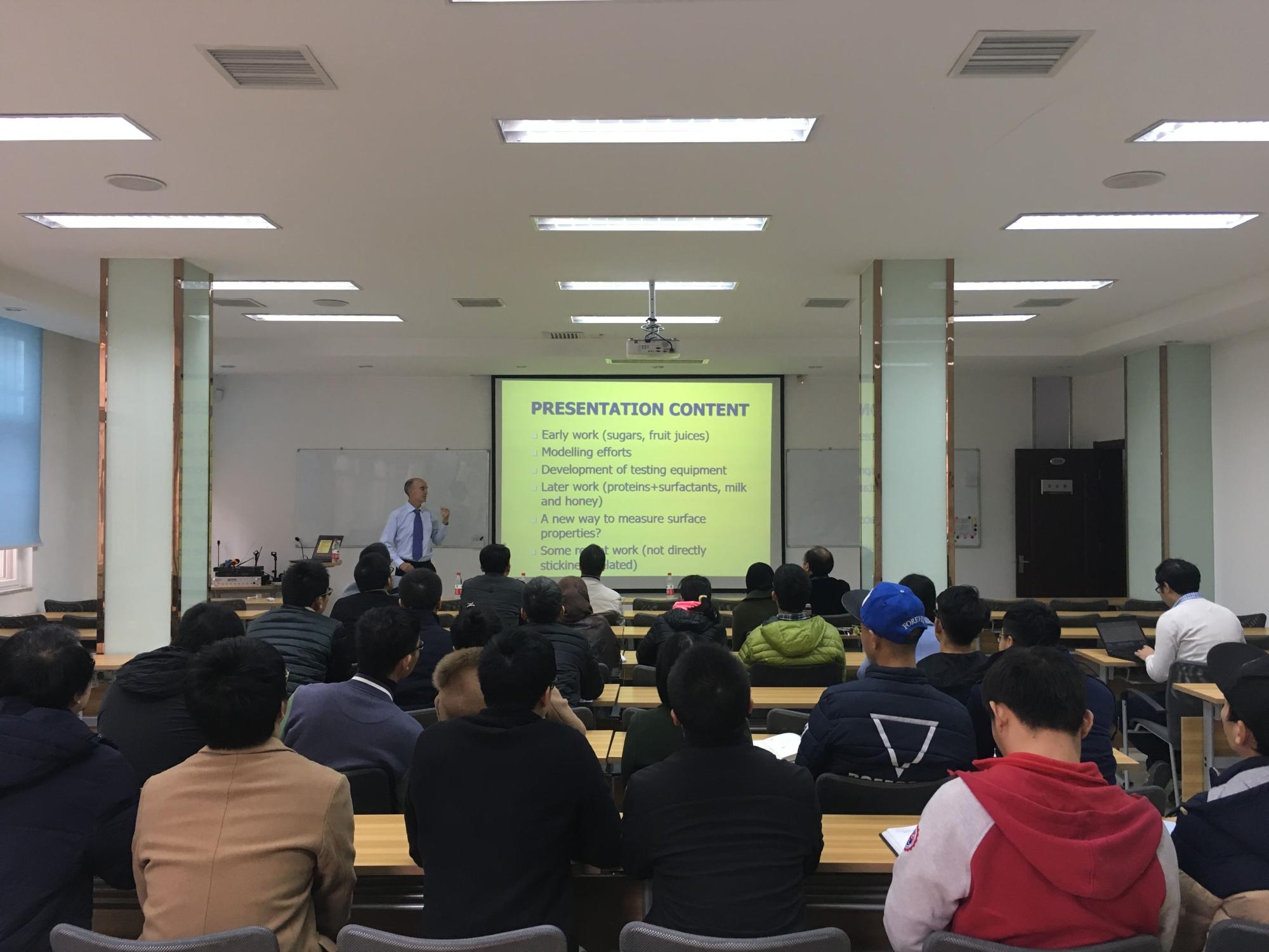 11月21日上午,Tony Howes副教授做了题为“Powder Stickiness Research at The University of Queensland and Publishing and Writing Strategies”的学术报告。首先,Tony Howes讲述了团队初期对喷雾干燥含糖果汁(将浓缩果汁制成果粉)的相关研究,阐述了蛋白质和其他添加剂对牛奶或其他产品干燥的影响机制。其次,Tony Howes介绍了干燥特性实验模型以及不同实验设备对实验结果的影响,总结了他们团队的测量物质表面特性的新方法,该方法可以给蛋白质及表面活性剂的相关研究提供新思路。在报告的最后,Tony Howes对如何撰写学术论文、如何投稿介绍了自己的经验和看法,并与在座的老师和同学进行了深入的讨论。