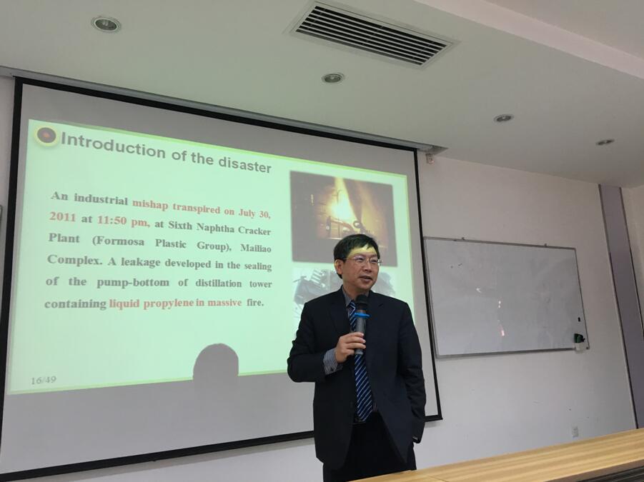 师生介绍其在台湾地区从事的安全生产重点研究项目,研究涉及化工、医药、环保等重要领域。接着,徐副校长为以丙烯纯化工艺为大背景并揭示其潜藏的安全隐患。研究表明,丙烯在进行吸附脱水反应时会产生大量的热,而当反应温度超过150度时,采用的吸附剂高活性氧化铝会转变为催化剂,促使丙烯发生寡聚合反应,从而产生更大的热量,且高温使得反应器材质降伏强度下降,致使高压丙烯喷出引发火灾。研究并采用量热技术与CFD数值模拟相结合的方式,重现其灾害发生过程及提出系统改善建议,并为该工艺的灾害防控策略提供了理论支持。