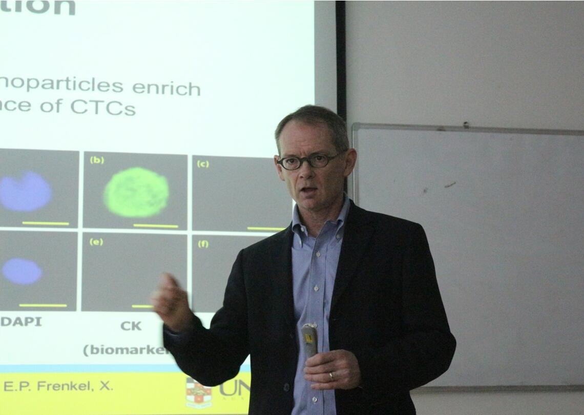Justin Gooding 教授毕业于牛津大学及剑桥大学,曾任国际电化学学会副主席,澳大利亚皇家电化学学会主席。目前为澳大利亚研究委员会桂冠学者,同时任澳大利亚纳米医学中心联合主任及美国化学会旗下国际学术期刊ACS Sensor的主编。Justin Gooding 教授主要致力于纳米生物传感器、生物医用材料、功能性电化学材料的研究,在Nature Immunology, Nature Nanotechnology, Nature Communications, AM, JACS等国际顶级学术期刊发表论文400余篇。教授以其特有的幽默的表达方式及其精彩的PPT内容赢得了同学们的阵阵掌声,报告在十分轻松的气氛中结束。