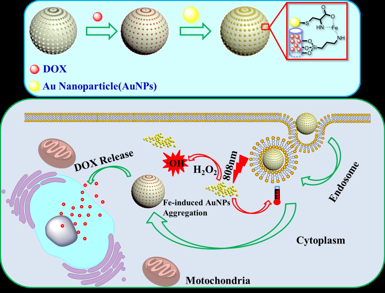 在前期工作基础之上,本研究论文进一步提出集成肿瘤微环境响应型药物控释、肿瘤微环境触发的光热治疗和肿瘤微环境敏感型的催化反应,进而构筑多模式协同治疗的智能平台来精准治疗肿瘤的新思路。为了实现该设想,研究团队设计并合成一种半胱氨酸修饰的金纳米粒子以及氨基功能化的介孔二氧化硅纳米粒子,通过引入亚铁离子使金纳米粒子通过配位键键合到二氧化硅表面实现对介孔内药物的封堵。该纳米载体在肿瘤细胞内低pH下诱导携带亚铁离子的金纳米粒子从载体表面脱落释放出装载药物,同时脱落的金纳米粒子将进行原位自组装团聚从而能够用于光热治疗。此外,体系内的亚铁离子将催化细胞质内存在大量过氧化氢产生羟基自由基,从而达到光疗-化疗-催化协同治疗的目的(图1)。