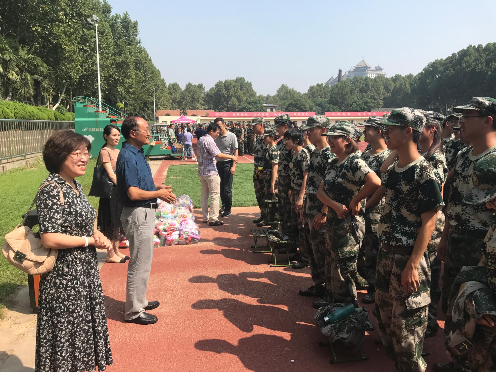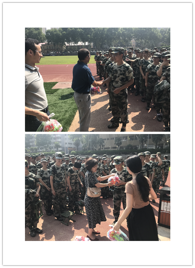 在东操场慰问托管在本院的2018级军训新生。分党委书记张早校、副书记沈人杰、副院长李云带领四位新生班主任老师及院办主任一同向124位2018级新生致以诚挚的问候并送上慰问品。