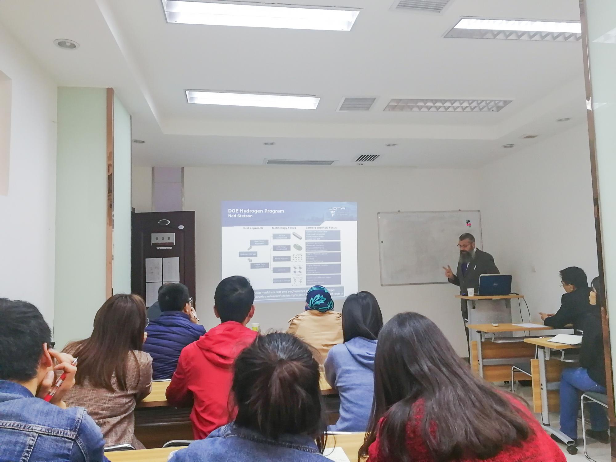 10月18日、20日,Huot教授分别以“Development of metal hydrides for hydrogen storage applications”、“Discussion on writing and submitting scientific papers”为题作了两场公开学术报告。在第一个报告中,Huot教授首先介绍了氢能应用的大背景和储氢技术发展现状,接下来以金属氢化物固态储氢为切入点,结合团队近期研究进展重点介绍了低成本TiFe材料、BCC合金、镁基复合材料的特点和活化过程的改进,强调了对于储氢材料进行机械合金化、纳米化过程中无定形相的生成机理及其对储氢量衰减和动力学改善的影响。在第二个报告中,Huot教授首先综合作为期刊编辑、审稿人和作者的有关经验,向在场同学详细讲解了如何结合发表论文组织研究工作,结合案例说明了在摘要、文献综述、研究方法、结果与讨论、结论等各部分撰写中应注意的问题。接下来他分析了完成论文后投稿直至发表的各个阶段的稿件处理过程,给出了一些实用小窍门,特别强调了结合研究领域选择投稿期刊和推荐评审专家的重要性。
