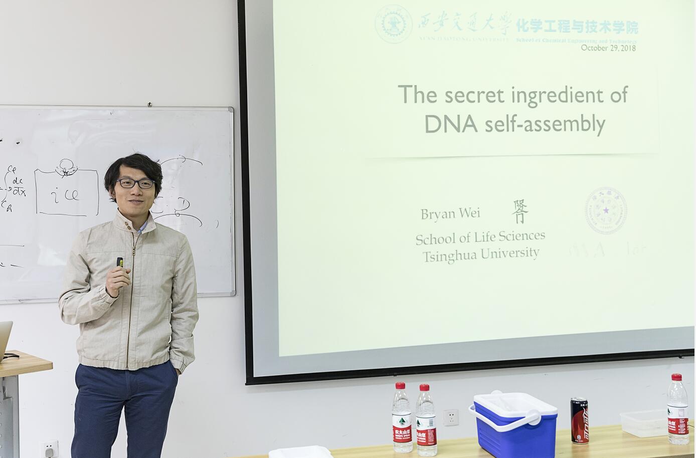 特聘研究员魏迪明博士做了以“The secret ingredient of DNA self-assembly( DNA自组装的秘方)”为题的工作汇报,向大家介绍了DNA自组装纳米技术的由来和他的代表性研究成果。在他的细心讲解下,在座的师生了解了DNA除了做为遗传物质载体,还可以利用碱基互补配对原则,通过巧妙地设计,进而自发地实现数以万计的DNA单链条有序自组装,形成非常复杂的拓扑结构。报告之后,魏研究员还与本院师生关于该项技术的潜在应用深入地交换了意见。
