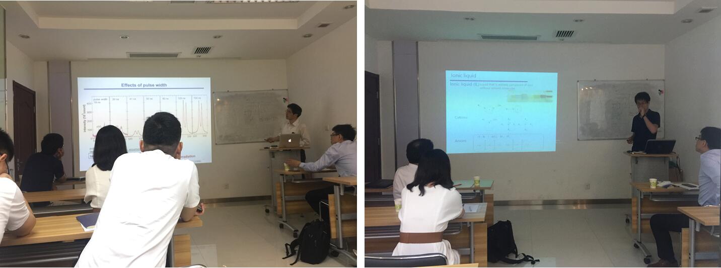 访问期间,作花哲夫教授、西直哉副教授分别做了题为《水下激光诱导等离子体及其在原位元素分析中的应用》(Laser-induced plasma in water and its application to in situ elemental analysis)和《离子液体电化学界面的结构与动态》(Structure and dynamics at the electrochemical interface of ionic liquids)的学术报告。作花教授的报告以深海岩矿无采样原位元素检测为切入点,分析了传统方法的不足和激光诱导等离子体的优势和测量原理,比较了不同长度、不同模式激光脉冲对应的检测效果,通过实测结果证明了方法的有效性。西副教授首先介绍了离子液体的概念和潜在应用,接着结合自身研究,详细分析了离子液体界面的多层结构、超慢动态特性和生成贵金属一维结构的独特功能。