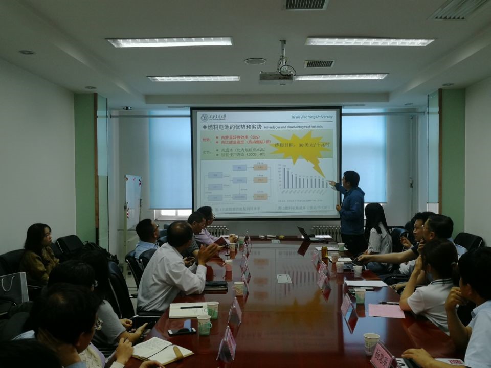 的多名教师分别以“氢燃料电池产业概况及大湾区项目介绍”、“低温质子陶瓷燃料电池材料及制备工艺”、“高密度储氢材料/系统及与燃料电池的集成”、“基于固态储氢氢燃料电池动力集成系统”、“SOFC应用和产业化&高性能质子交换膜燃料电池双极板的设计与开发”、“低成本直接甲醇燃料电池及催化剂开发”等为题介绍了各自在氢燃料电池及相关领域的研究成果。来访客人就报告内容频频提问,并从用户角度更清晰地界定了实际需求,现场互动气氛热烈。