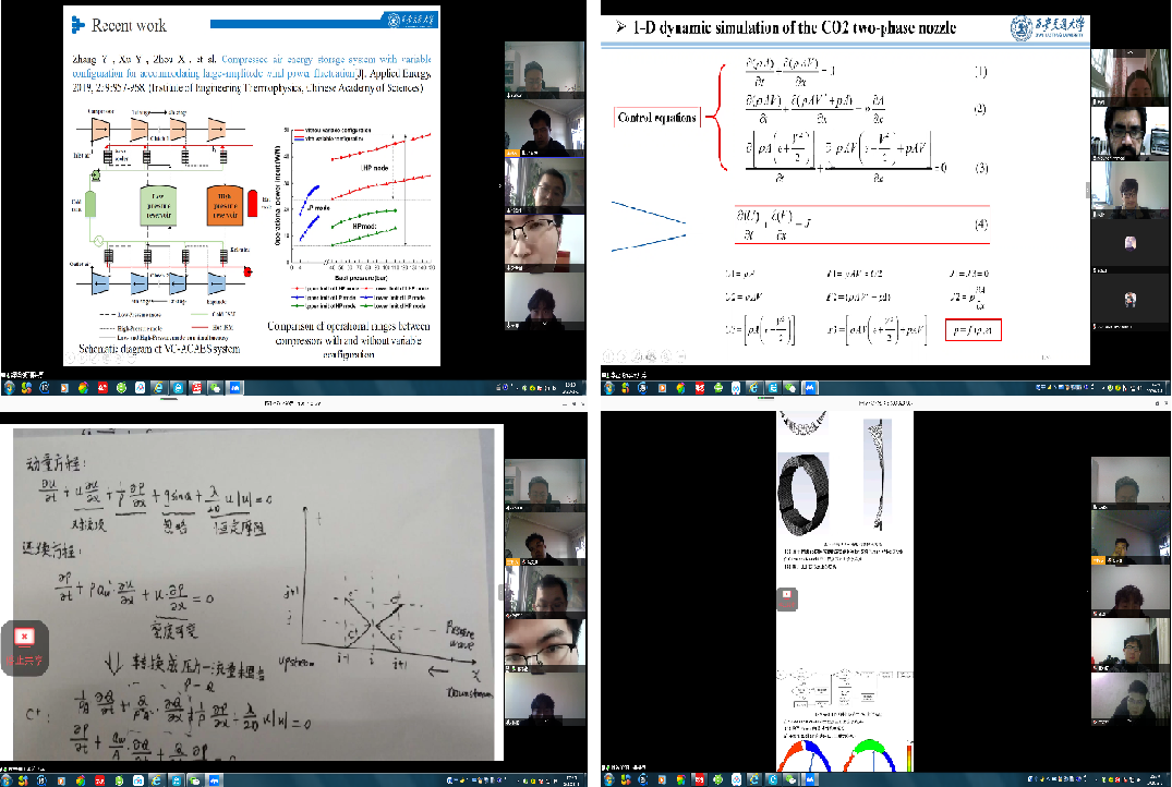 大四本科生杜如雪说她第一次频繁地使用学校的VPN,第一次使用腾讯会议。她的毕业设计是关于先进绝热压缩空气储能系统的设计,老师在组会上提出了很多建议,感觉帮助很大。本科生樊一楠同学假期在延安,在组会上看到大家都在克服各种困难专心科研,看到邓老师对每一个人的科研情况都进行了详细的询问与指导,也备受鼓舞。