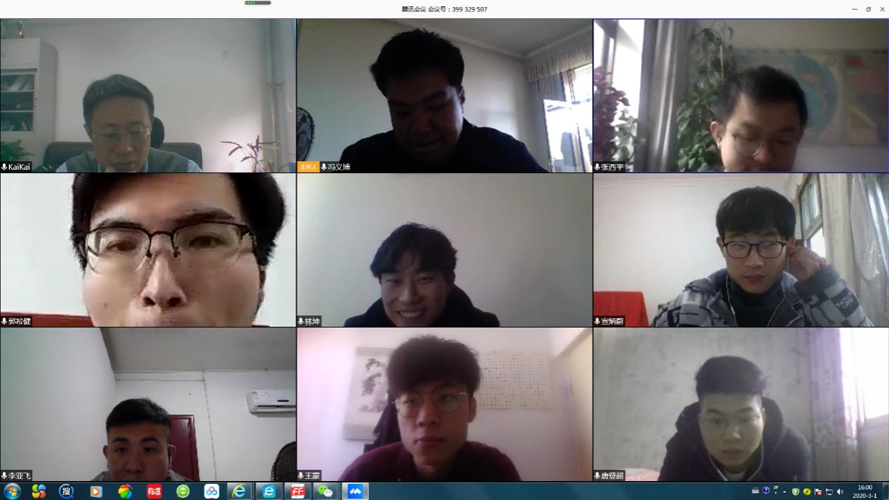 时间不觉到了六点半,所有组员结束了发言。在组会上我们相隔万里,但是心连成一片。大家不仅交流了科研工作,保证了课题组任务的正常进行,还互相交流了在家闲余时间的兴趣爱好培养,做美食、看好书,多位同学在家“宅”成了大厨。在“停课不停教、停课不停学、停课不停研、停课不停工”学校要求以及“每周一次组会”的老虎机游戏