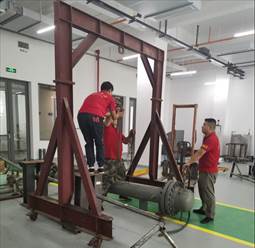 6月9日和10日,团队开始进行零部件与大型实验台的组装工作。与拆卸实验设备相比,安装实验设备难度更大,因为不论是喷射塔还是换热器,它们都是在底座上面固定的,想要将一个重量超过一吨的大家伙举至离地1米高的地方,已非人力所能及,而且由于创新港实验室大门的限制,大型叉车无法进入到实验室内去,经过讨论,团队最后决定使用龙门吊进行大型设备的吊装。在吊装时,得益于前期各位老师所制定的详细方案,实验台重建工作有序进行,工人师傅们熟练的操作着龙门吊,老师和学生们告诉师傅们各个设备所需要安装的位置,大家通力配合,相得益彰,使得整个安装过程顺利进行。