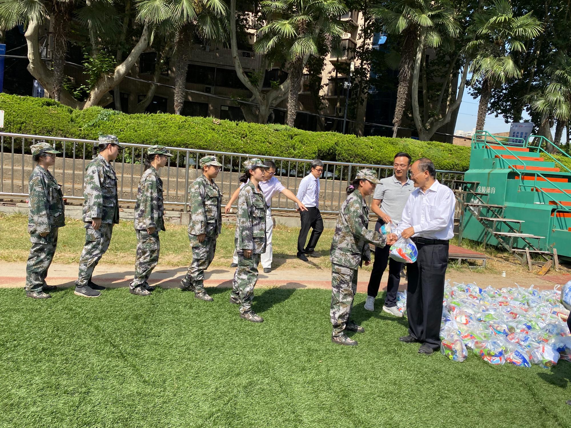 张早校书记、沈人杰副书记和系负责人及新生班主任看望慰问了参加军训的2020级本科生、教官和带队老师。