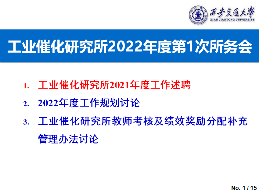 会议首先由副所长谢涛做2021年度工作业绩汇报,主要从科研项目、论文专利、学生培养、队伍建设、社会服务等多个方面进行。总体来说,2021年度工业催化研究所在各项工作方面都取得了较大的进展。随后,杨伯伦、杨贵东两位老师就2021年工作的亮点给予肯定,对存在的不足也给予了合理建议。