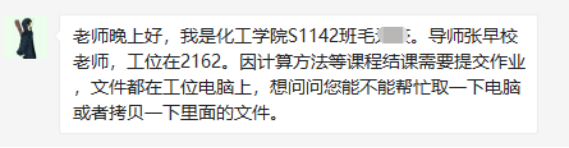 疫情的来势汹汹,也使部分学生没有及时将笔记本电脑、复习笔记等重要物品带回宿舍,导致隔离期间无法正常工作,严重影响了学生科研进度,同学们焦头烂额。留守的老师们了解情况后,充分发挥了桥梁作用,及时将电脑等物品从19号楼取出来,严格按照防疫要求转交到学生手里,另外部分学生因远程办公,还需要恢复办公室网络等,驻扎创新港的研究生有近500多人,老师们事无巨细,本着对每个学生高度负责的态度,尽可能降低疫情对学生科研工作的影响。