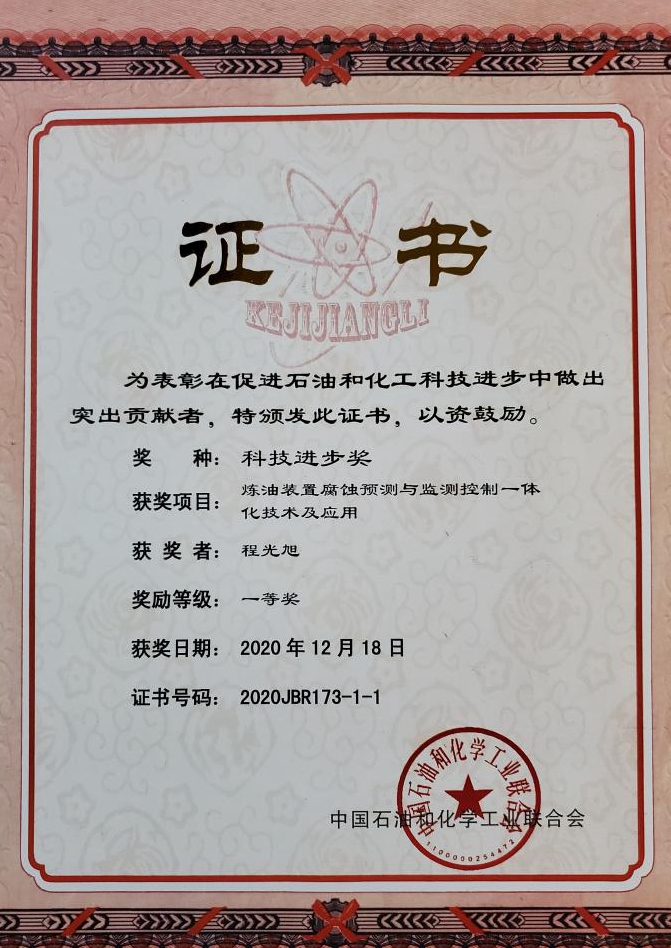 程光旭教授等针对炼油过程腐蚀影响长周期安全运行问题,创新开发了基于深度学习的循环水系统自动防腐控制技术,形成了一套集设备腐蚀监测、腐蚀信息管理、腐蚀控制于一体的腐蚀实用计算机软件系统。推动了我国炼化企业防腐技术进步,为炼油装置实现长周期安全稳定运行作出了重大贡献,获得2020年度中国石油和化学工业联合会科技进步一等奖。