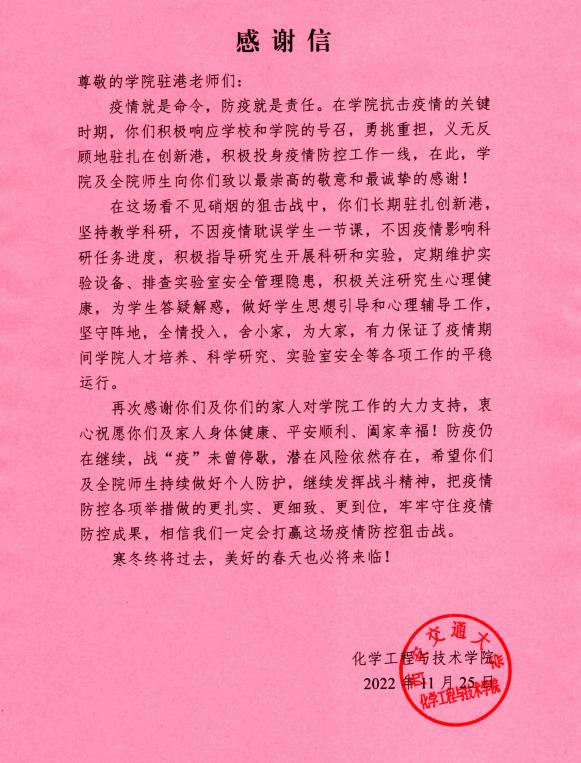 工作的大力支持,衷心祝愿你们及家人身体健康、平安顺利、阖家幸福!防疫仍在继续,战“疫”未曾停歇,潜在风险依然存在,希望你们及全院师生持续做好个人防护,继续发挥战斗精神,把疫情防控各项举措做的更扎实、更细致、更到位,牢牢守住疫情防控成果,相信我们一定会打赢这场疫情防控狙击战。