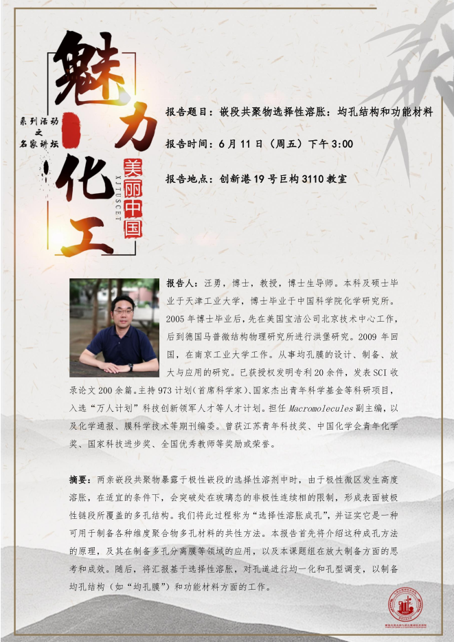 6月11日(周五)下午3:00在创新港19号巨构3110教室,国家自然科学基金杰青项目获得者、“万人计划”科技创新领军人才、Macromolecules期刊副主编汪勇教授将带来题为《嵌段共聚物选择性溶胀:均孔结构和功能材料》的学术报告,请各位老师积极参加,也请各位导师督促研究生积极参加。