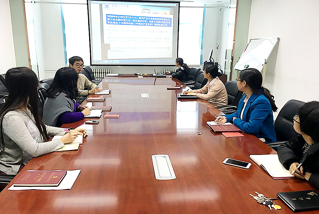 办公楼504会议室举行,本次主题为:十八届六中全会精神解读及新版党章学习。会议由行政与实验党支部书记张敏老师主持,行政与实验党支部王蔚主讲,支部全体党员参加了本次学习活动。