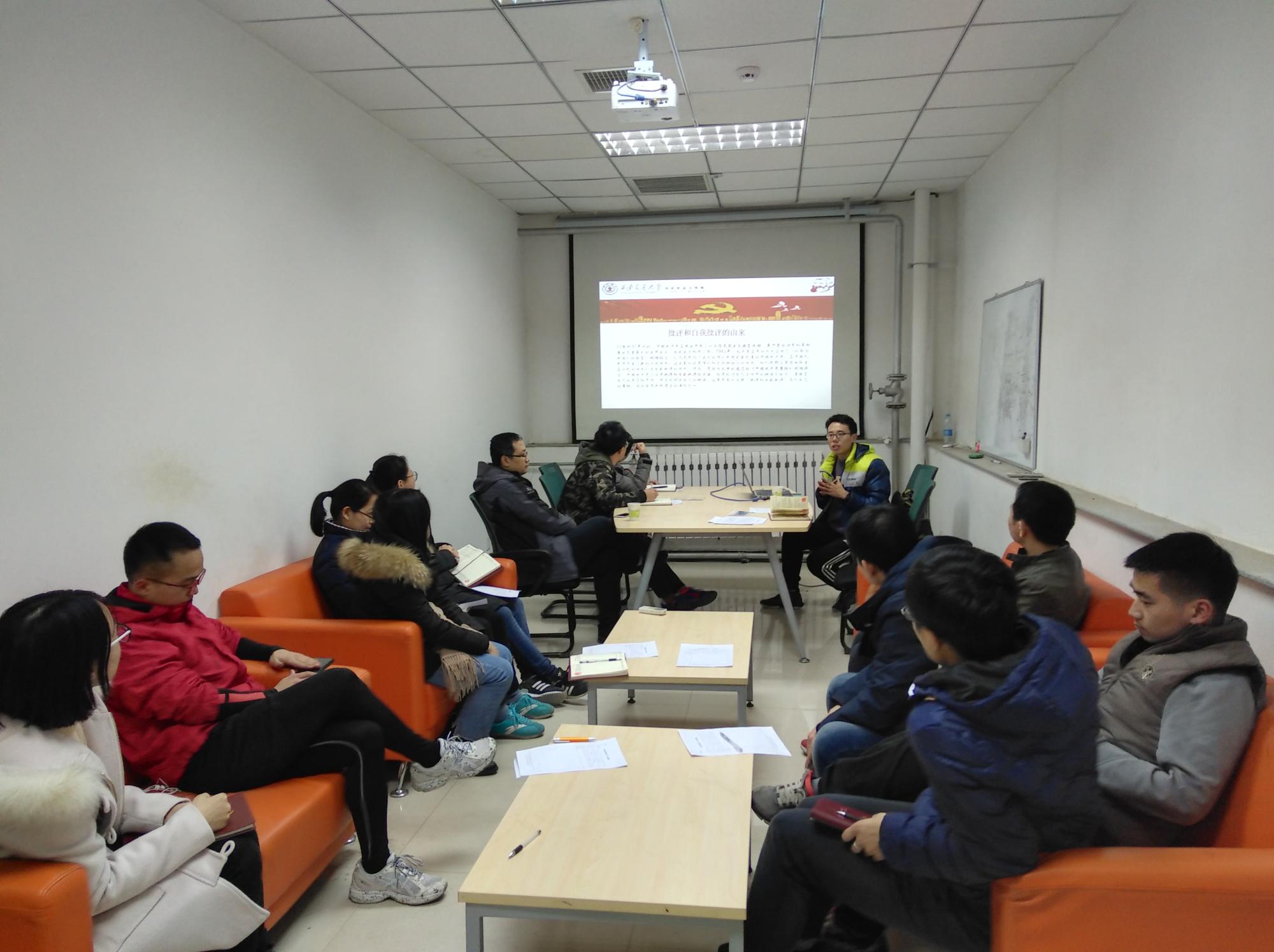 紧接着,支部书记张洋从自身和支部工作两方面进行了自我批评,首先他就个人方面认为在科研上缺乏持之以恒的努力,在新课题中面对困难没能够及时寻求解决办法,导致科研进展缓慢,同时参加的体育锻炼较少,应该加强身体锻炼。其次,他就支部建设方面谈道,本年度支部组织生活更加规范但是缺乏活力,这是自己做的不好的地方应当改进,应当充分将党的先进理论和实际相结合。同志们对支部建设也纷纷提出了中肯的建议,比如应该组织一些体育活动、走出办公室、走出照本宣科式的组织生活等。综合支部成员的批评与自我批评,以及对支委工作的评议,支部党员主要存在以下问题: