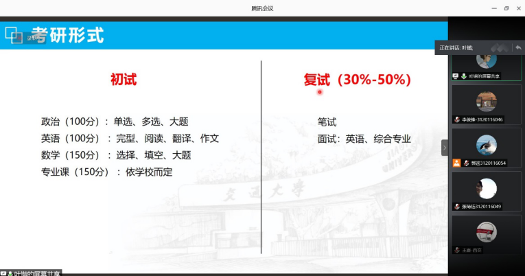 最后一位同学是叶锴同学,叶锴同学更是以笔试第一名的好成绩被交大录取。他给学弟学妹们分享了考研过程中自己的复习经验,侧重点和怎样学会合理安排自己的时间,以及一些中肯的建议,例如:凡事预则立不预则废;要坚定信念,抛去杂念,投入身心等等。考研想想都可怕的事情,但是在叶锴同学的分享下变成了一种锻炼,一种机遇,一种激发自己潜力的手段。学弟学妹都有股蠢蠢欲试的劲头,相信自己一定能够考上交大。