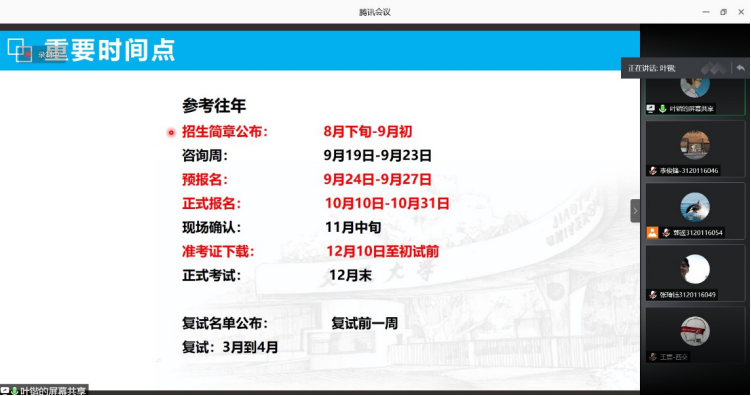 接下来是本科来自中国海洋大学的王震同学,王震同学本科期间获得中国海洋大学的保送资格,并成功保送到西安交通大学攻读硕士研究生。王震同学主要从全国优秀大学生夏令营和推免系统两方面出发,介绍西安交通大学推免政策和如何保送西安交通大学攻读研究生。通过王震同学的讲解,参会的同学们都认识到只有优秀的大学才能吸引优秀的人才,西安交通大学的学生来自全国各地,都是优中选优的,自己只有努力进入名校才能有机会与来自全国优秀学子同台竞争的机会。这样自己才能取长补短,完善自己。除此之外,听完王震同学的讲述很多同学都打消了从高中老师口中听到的“大学就可以尽情放松”的话,大学也需要努力,如果想要获得推免资格,不仅仅是成绩优异,也要多参加学科竞赛,跟着老师早日开展实验,了解自己的专业未来发展,做到自身的全面发展。