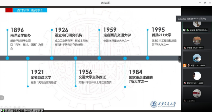 2021年2月25日,西安交通大学化学工程与技术研究院的郭遥、李俊锋、张琦钰、叶锴、王震和吴振迪六名同学、进行了以“西迁精神永流传”为主题的假期宣讲社会实践活动,面向的学生主要是大连理工大学,郑州大学和新疆大学等学校的本科生。让更多人认识西安交通大学,传承“西迁精神”;让西安交通大学成为每名学子深深向往的殿堂;让“西迁精神”传遍祖国的大江南北,深入每位人们心中。由于疫情的原因,此次活动选择线上进行。活动主要介绍了西安交通大学的历史与发展,将交大硬件设备先进,师资雄厚的硬实力以及它的丰富有内涵的文化软实力展示在大家面前。还包括推荐免试研究生的一些相关政策和建议以及参加研究生考试和复试的一些建议,解读交大让更多的优秀的人有信心来报考交大,为交大注入更多优秀的血液。