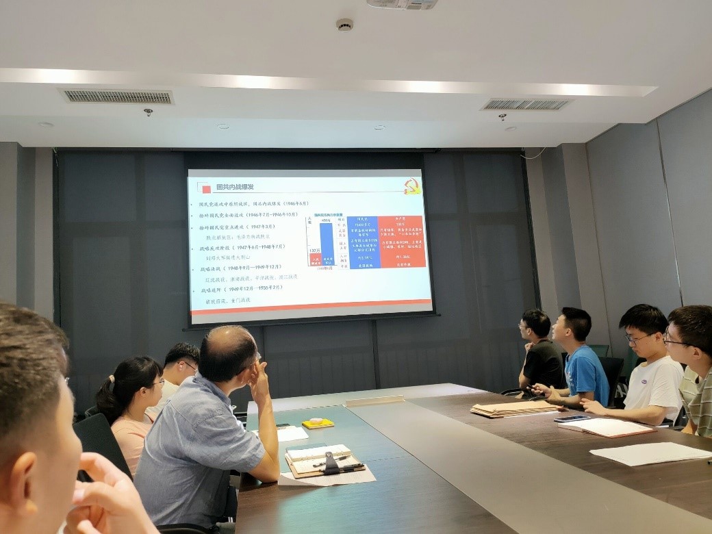 会议第一项由硕9133党支部朱鹏飞同志介绍本支部在上一阶段“四史”学习的主要成果和经验做法。硕9133党支部主要从“编年体”和“纪传体”两个方面来对党史进行学习。朱鹏飞强调:百年党史是一个政党的发展史,也是一部信仰的传播史,还是一个国家和民族从富起来到强起来的奋斗史。学习党史要有编年体的视角,要搞清楚发展历史的来龙去脉,弄清楚历史变革的前因后果,把历史事实读懂。采用“编年体”的方式可以从宏观上把握我们党的发展历史,对我们党的历史有全面的了解,避免了党史学习的碎片化和局部化。其次党史学习也要有“纪传体”的视角,要正确了解重大事件和人物,汲取榜样的力量,把历史规律读透,这样才能学到党史的精髓,才能在后续的工作和学习工作中保持昂扬的斗志。