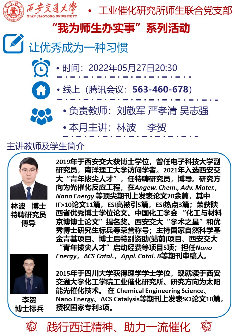 2022年5月工业催化所师生联合党支部在创新港举办了“我为师生办实事”系列活动之“让优秀成为一种习惯”科研经验分享会。本次经验分享会邀请了西安交通大学线上老虎机游戏网站