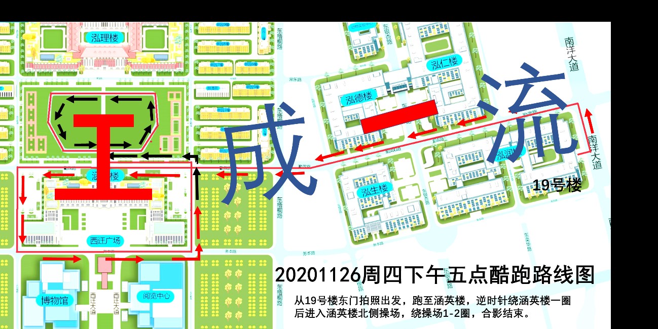 跑步大军由泓润楼东门出发,一路向西跑至涵英楼,继而绕涵英楼一周后进入操场,个人根据自身情况绕操场跑若干圈。该跑步路线一方面让我们领略了新港的优美环境及壮阔楼宇,另一方面形成了“工”字及“一”字,寓意我们线上老虎机游戏网站