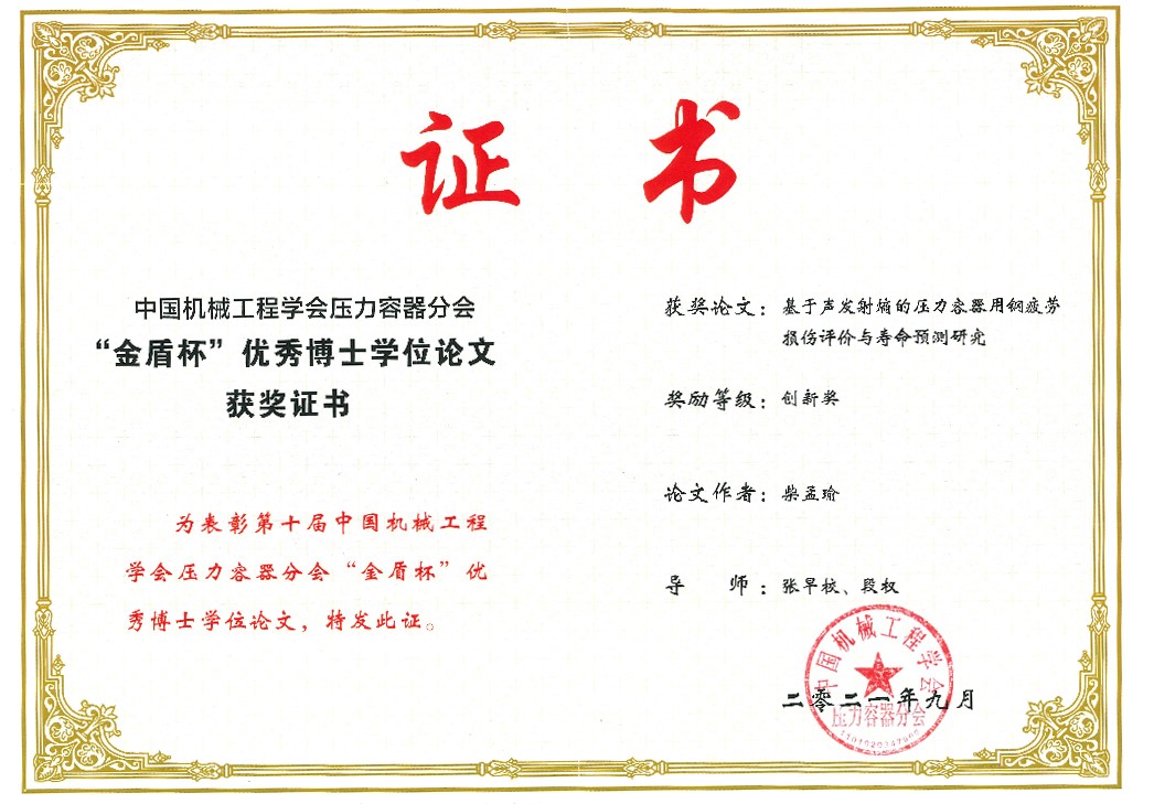 张早校教授指导的柴孟瑜博士学位论文荣获“中国机械工程学会压力容器分会优秀博士学位论文奖”,奖励等级为创新奖。此次为西安交通大学首次获得压力容器分会优秀博士论文奖。