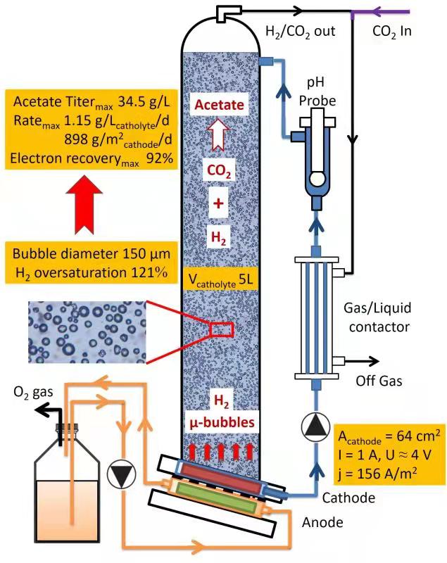 郭坤特聘研究员课题组构建了一种电解氢气鼓泡塔反应器(图1)。该装置将电解槽置于反应器的底部用于原位提供氢微气泡,鼓泡塔置于电解槽上部以增加电解氢气泡在反应器的保留时间。在此反应器中接种同型产乙酸功能菌群,在156 A/m2电极电流密度条件下,鼓泡塔的存在可将反应器的库伦效率从5%提高到70%。该反应器的产乙酸速率达到898 g/m2阴极/d(1.2 g/L反应器/d),是绝大多数基于生物膜的MES反应器产乙酸速率的10倍以上。