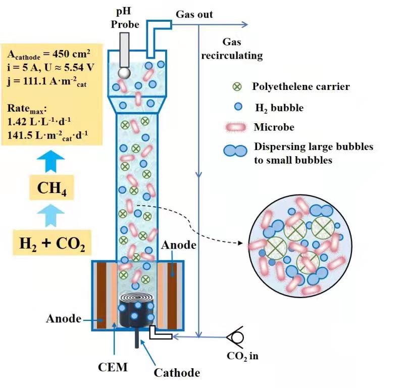 王云海教授合作,设计开发了电解氢气移动床生物膜反应器 (图2)。移动床内填料的存在,进一步提升了氢气泡的停留时间,强化了气液传质,同时提高了反应器内的生物量。该反应器将前一种反应器的产乙酸速率提升了四倍,达到4.1 g/L反应器/d。此外,在该反应器内接种产甲烷功能菌群,在2 A的恒电流运行模式下,反应器的库伦效率高达92.5%,甲烷的产率最高可达1.4 L/L反应器/d(141.5 L/m2阴极/d),是已报道最大值的两倍左右。