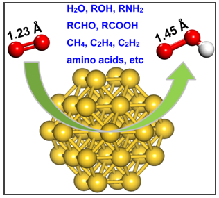 该研究采用密度泛函理论计算方法,系统探讨了氧气在水、醇等16中含氢底物协助下的活化机理。研究结果表明,含氢物种不仅可以增强O2在纳米金上的吸附,而且可以转移氢原子至O2,使其以过氧氢基团(OOH)活化。除甲烷以外,其它15种R-H转移氢原子至O2的活化势垒均低于0.50 eV,表明O2通过OOH实现活化的可行性。进一步研究表明,OOH在CO氧化反应中表现出比吸附态的O2和氧原子更高的活性。该研究打破了氧气在金-载体界面处活化的一贯认识,提出氧气借助含氢底物(R-H)实现活化的新机理,对于丰富氧气在金催化剂上的活化理论具有重要意义。