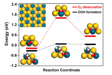 该研究所设计的Au-Pd催化剂具有特殊的表面结构:Au/Pd摩尔比为3:1,其中每一个Pd原子均被周围的Au原子隔离,呈现单分散的特性(如上图的左上插图所示)。这种结构不仅具有最优的化学稳定性,而且可以调控O2以过氧氢基团(OOH)形式活化,并抑制O2的直接解离为氧原子,这正是Au-Pd催化剂表现出优异活性和选择性的关键。此外,Au-Pd双金属催化剂在醇类氧化反应中表现出双官能团作用:活性更高的Pd作为反应的活性中心,而活性更低的Au降低了产物在表面的稳定性,使其更容易从表面脱附,避免被进一步氧化。该研究从氧气的活化机制出发,提出了一种调控氧化反应选择性的新思路,对于高性能选择氧化催化剂的开发具有重要的借鉴意义。