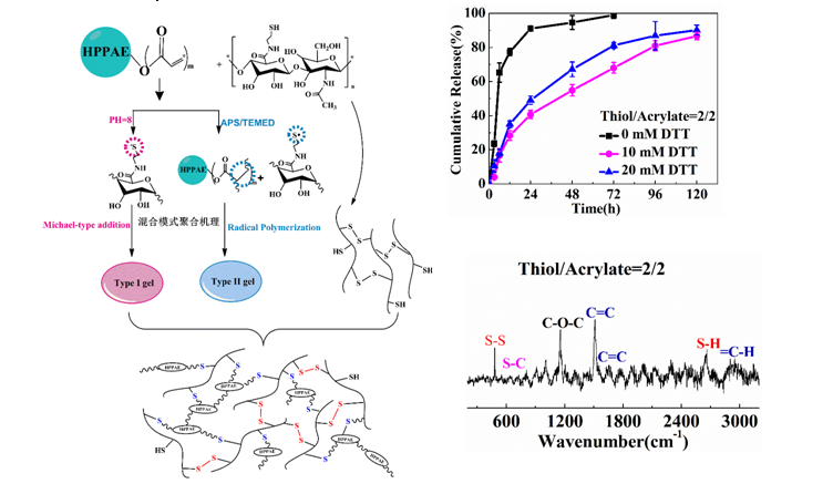 采用天然大分子透明质酸(HA)与合成高分子超支化聚磷酰胺酯(HPPAE)为原材料,通过迈克尔加成反应(TypeⅠ)或自由基加成反应(TypeⅡ)制备还原敏感型可注射水凝胶。通常,二硫键可以在还原介质二硫苏糖醇(DTT)的作用下断裂,从而加速凝胶网络瓦解,促进药物释放。而此项研究发现,TypeⅠ型水凝胶在还原介质DTT中释药更为缓慢,其原因归结于凝胶体系中富余的双键,促使体系二次凝胶化,从而延缓了蛋白的释放。此发现对富含二硫键水凝胶体系在药物控释方面的应用研究有重要的参考价值。