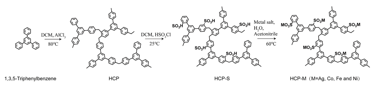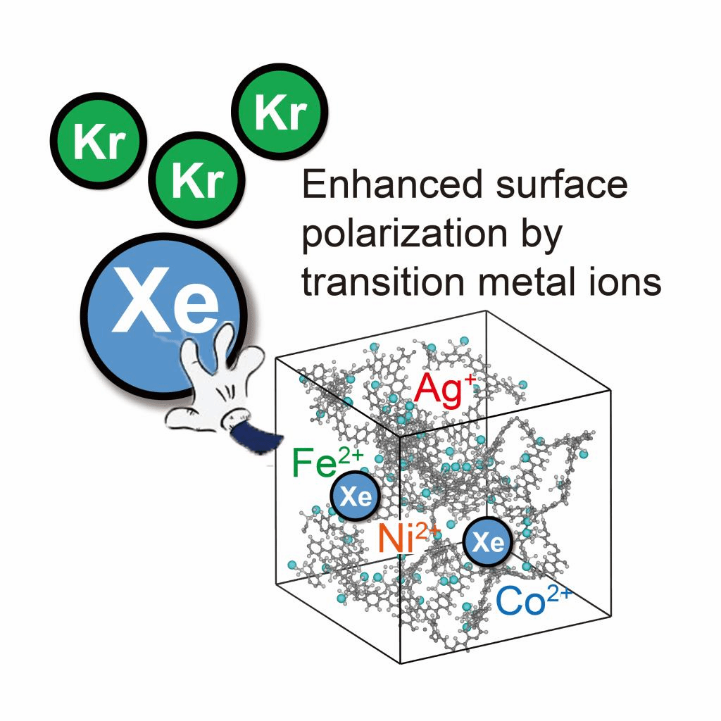 马和平研究员团队通过在微孔聚合物孔表面修饰过渡金属离子,增强其对Xe/Kr的诱导极化能力,从而实现其高效吸附分离。研究中采用基于1,3,5-三苯基苯为单体的超交联聚合物(HCP)作为多孔基体。HCP被磺酸化后(HCP-S),选择Ag、Fe、Co和Ni离子进行修饰(HCP-M),在HCP孔道形成表面电势。DFT计算证实HCP-M表面金属位点可以通过电荷转移效应诱导Xe的极化。此外,金属离子修饰后的HCP-M的具有超微孔结构(孔径小于0.7 nm),与Xe的动力学直径比较接近。因此,表面电场极化和孔径约束的协同效应使HCP-M表现出较高的Xe吸附性能。