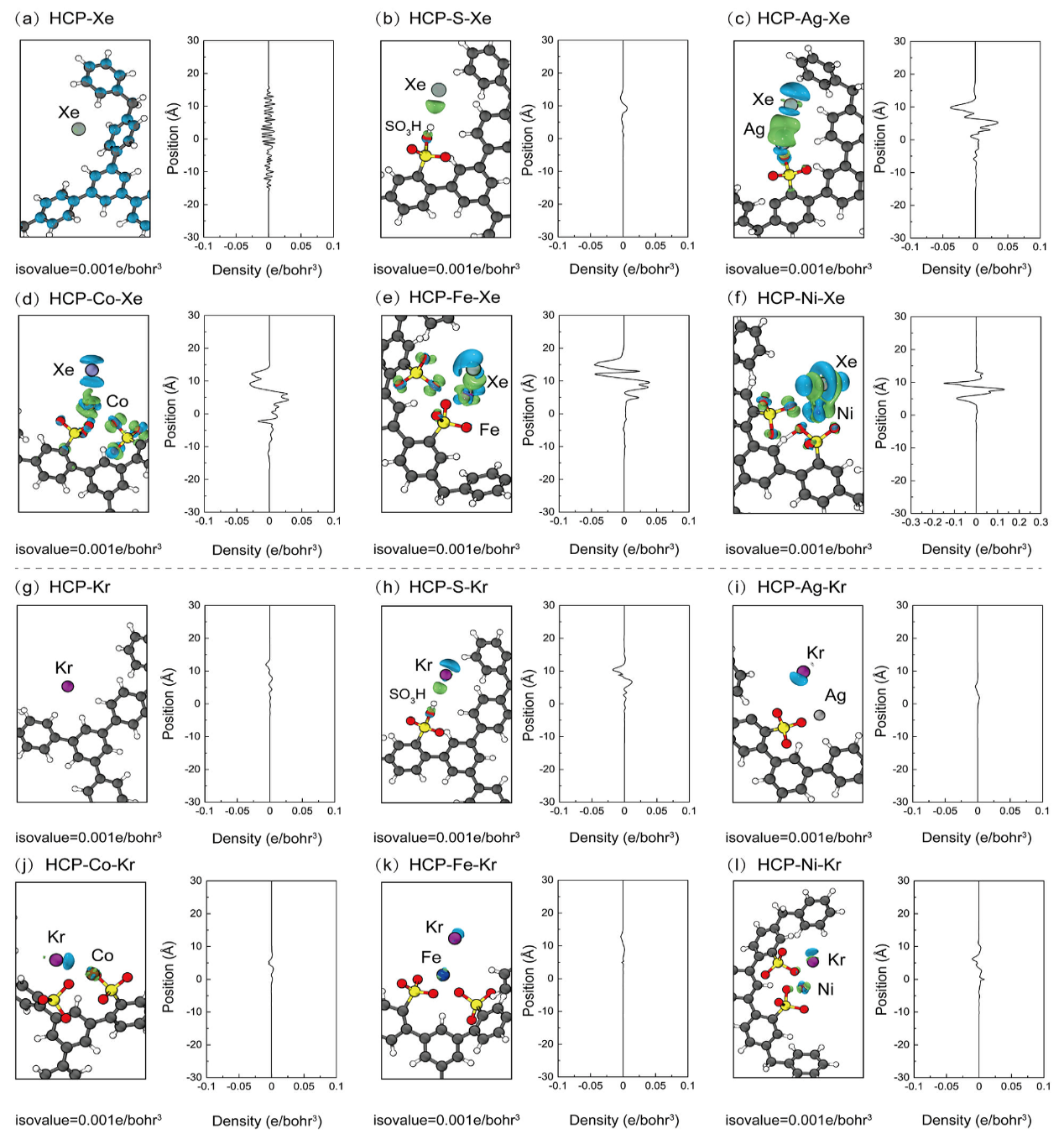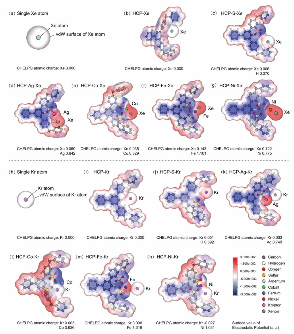 金属离子的引入可以调节HCP材料的表面静电势(ESP)。通过DFT计算得到HCP、HCP-S和HCP-M的ESP和电荷密度差数据(图3和图4)。当Xe靠近HCP-M的金属位点时,Xe原子的范德华表面显示出正的静电势(图3d-g),表明了金属离子对Xe的极化作用,该作用使得材料与Xe之间产生了较强的诱导力,原因主要是由于过渡金属不饱和d轨道以及Xe的高极化率。CHELPG原子电荷分析也表明了电子从Xe转移到金属位点上,极化的Xe原子呈现正电荷,电荷值为0.035-0.143。通过电荷密度差分析,发现Xe原子与HCP-M结合时,电子密度发生了明显变化,金属离子的电子密度增大,而Xe的电子密度降低(图4)。结合原子电荷数据计算得到了Xe和Kr的感应能Φp,结果表明HCP-M与Xe有更强的“诱导-偶极”相互作用,说明了金属离子对Xe的选择性吸附。