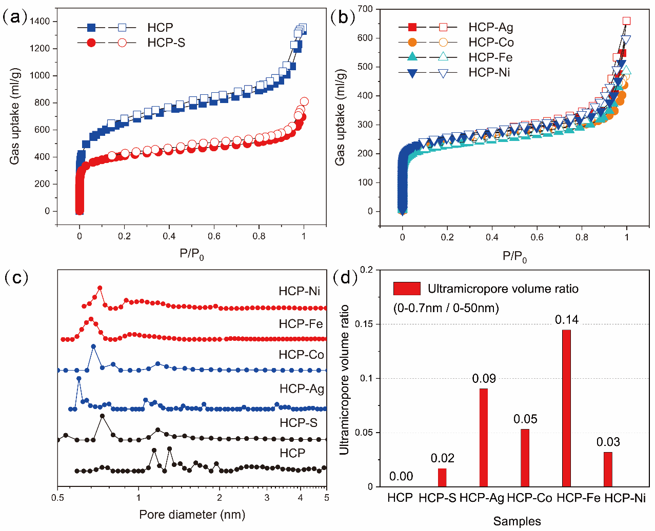 图2HCP和HCP-M的77k N2吸附等温线(a-b)、HCP系列样品的孔径分布(c)和孔径在0-0.7nm/0-50nm的孔体积比率(d)。