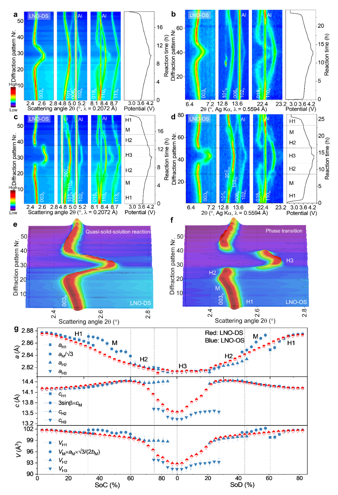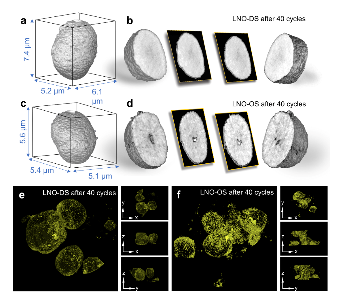 (KIT)、布鲁克海文国家实验室(BNL)和西班牙同步辐射中心(ALBA)等相关科研人员合作,利用原位同步辐射衍射(SXRD)、透射式X射线显微镜(TXM)和X射线吸收近边结构(XANES)组合的成像技术深入解析了镍酸锂(LNO)材料在循环过程中的结构演变、形貌特征和价态变化,并通过控制表面阳离子无序度,促使镍酸锂正极材料表面形成一层纳米级的无序层状保护膜,大幅缓解材料在循环过程中的氧气析出和机械失效,从而显著提升其循环稳定性和热稳定性,如图1所示。同时阐明了由于晶格氧析出造成颗粒内部形成三维大孔结构是导致材料容量快速衰减的主要原因,如图2所示。此外,原位同步辐射衍射进一步揭示了具有不同表面结构的镍酸锂正极材料在循环过程中表现出两种不同的相变机制,如图3所示。该研究工作为提高镍酸锂的循环稳定性提供了一种新思路,有望推进超高镍正极材料的商业化应用。