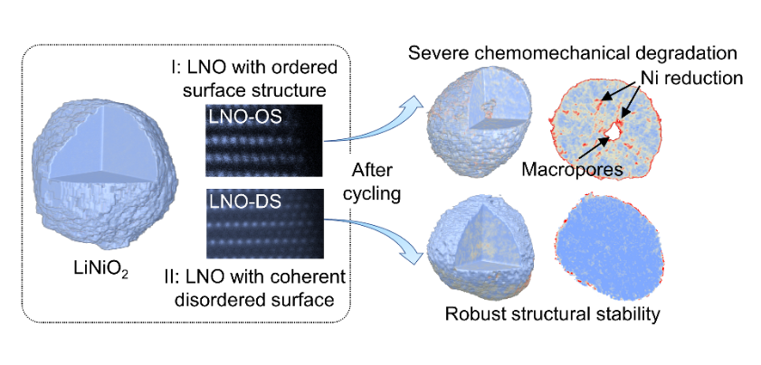 图3镍酸锂表面的无序和有序层状结构导致两种不同的相变机理