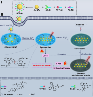 张彦民教授团队构建了一种唾液酸(SA)、叶酸(FA)和三苯基膦(TPP)共修饰的金纳米颗粒(SFT-Au),其利用线粒体中丰富的钙,以及SFT-Au的钙螯合和钙依赖光热特性,实现肿瘤线粒体的精确快速钙化,有效治疗恶性肿瘤。在治疗过程中,SFT-Au首先通过FA和TPP的逐步靶向过程在肿瘤线粒体中积累。之后,SA片段进一步与肿瘤线粒体中过表达的Ca2+结合,诱导SFT-Au聚集。SFT-Au不仅聚集Ca2+启动线粒体钙化,而且在808 nm照射下原位生成光热剂进行光热转化,促进线粒体钙化。从而有效抑制肿瘤细胞的能量代谢,进行饥饿治疗,并对肿瘤细胞进行持续的光热损伤,提高治疗效率(图1)。体外和体内实验结果表明,Ca2+依赖性光热疗法和光热转化促进线粒体钙化,显著抑制肿瘤生长,同时避免了意想不到的副作用。